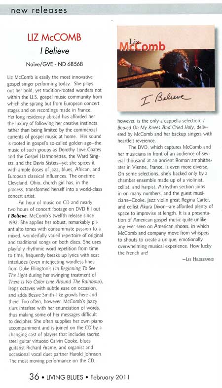 Living Blues LIZ McCOMB par Lee Hildebrand Liz McComb is easily the most innovative gospel singer performing today. She plays out her bold, yet tradition-rooted wonders not within the U.S. gospel music community from which she sprang but from European concert stages and on recordings made in France. Her long residency abroad has afforded her the luxury of following her creative instincts rather than being limited by the commercial currents of gospel music at home. Her sound is rooted in gospel’s so-called golden age—the music of such groups as Dorothy Love Coates and the Gospel Harmonettes, the Ward Singers, and the Davis Sisters—yet she spices it with ample doses of jazz, blues, African, and European classical influences. The onetime Cleveland, Ohio, church girl has, in the process, transformed herself into a world-class concert artist. An hour of music on CD and nearly two hours of concert footage on DVD fill out I Believe, McComb’s twelfth release since 1992. She applies her robust, remarkably pliant alto tones with consummate passion to a mixed, wonderfully varied repertoire of original and traditional songs on both discs. She uses playfully rhythmic word repetition from time to time, frequently breaks up lyrics with scat interludes (even interjecting wordless lines from Duke Ellington’s I’m Beginning To See The Light during her swinging treatment of There Is No Color Line Around The Rainbow), leaps octaves with subtle ease on occasion, and adds Bessie Smith–like growls here and there. Too often, however, McComb’s jazzy slurs interfere with her enunciation of words, thus making some of her messages difficult to decipher. She often supplies her own piano accompaniment and is joined on the CD by a changing cast of players that includes sacred steel guitar virtuoso Calvin Cooke, blues guitarist Richard Arame, and organist and occasional vocal duet partner Harold Johnson. The most moving performance on the CD, however, is the only a cappella selection, I Bowed On My Knees And Cried Holy, delivered by McComb and her backup singers with heartfelt reverence. The DVD, which captures McComb and her musicians in front of an audience of several thousand at an ancient Roman amphitheater in Vienne, France, is even more diverse. On some selections, she’s backed only by a chamber ensemble made up of a violinist, cellist, and harpist. A rhythm section joins in on many numbers, and the guest musicians—Cooke, jazz violin great Regina Carter, and cellist Akura Dixon—are afforded plenty of space to improvise at length. It is a presentation of American gospel music quite unlike any ever seen on American shores, in which McComb and company move from whispers to shouts to create a unique, emotionally overwhelming musical experience. How lucky the French are!
