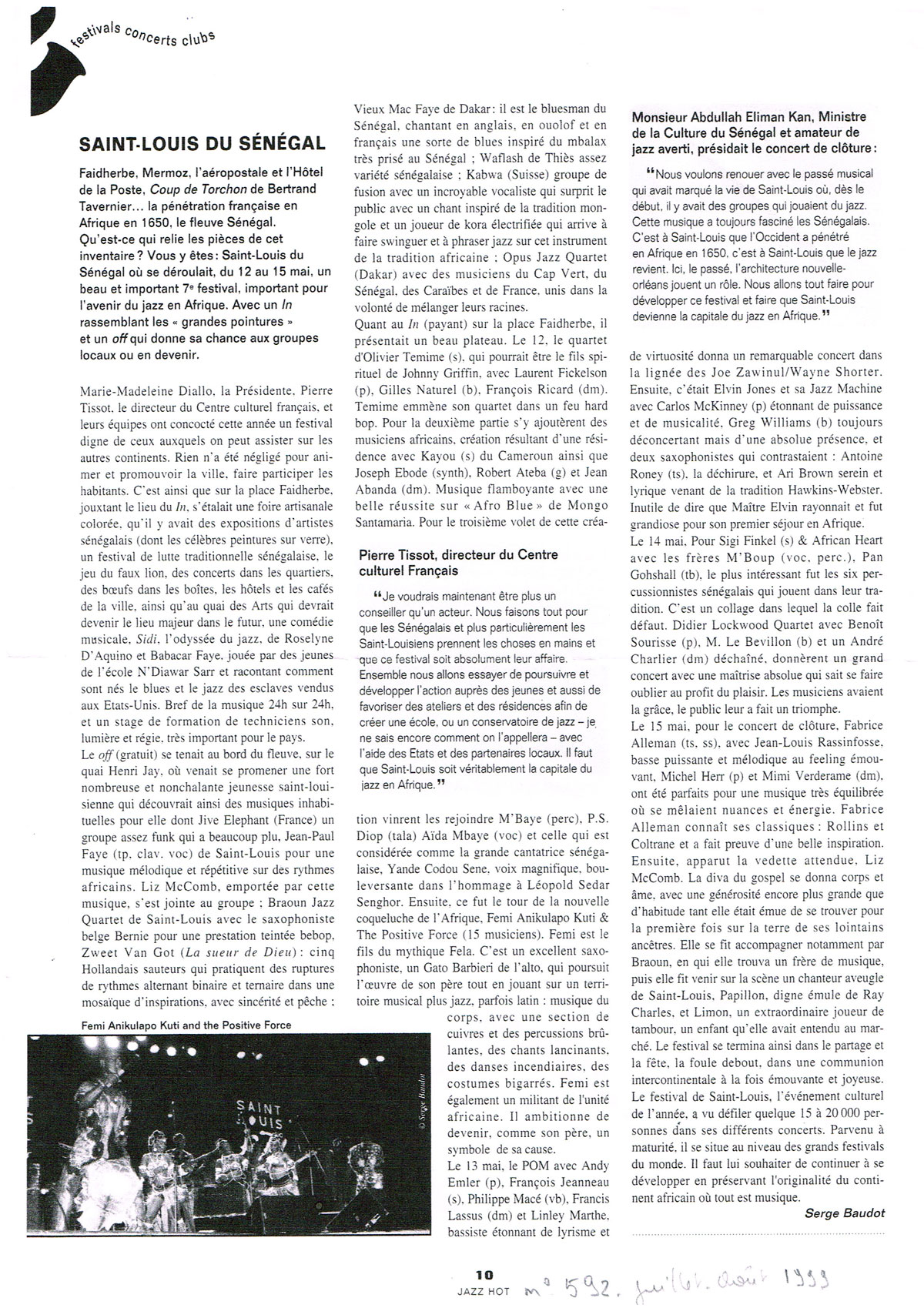 Pierre Tissot, directeur du Centre culturel Français « Je voudrais maintenant être plus un conseiller qu'un acteur. Nous faisons tout pour que les Sénégalais et plus particulièrement les Saint-Louisiens prennent les choses en mains et que ce festival soit absolument leur affaire. Ensemble nous allons essayer de poursuivre et développer l'action auprès des jeunes et aussi de favoriser des ateliers et des résidences afin de créer une école, ou un conservatoire de jazz - je ne sais encore comment on l'appellera avec l'aide des Etats et des partenaires locaux. il faut que Saint-Louis soit véritablement la capitale du jazz en Afrique. » Monsieur Abdullah Eliman Kan, Ministre de la Culture du Sénégal, et amateur de jazz averti, présidait le concert de clôture: « Nous voulons renouer avec le passé musical qui avait marqué la vie de Saint-Louis où dès le début, il y avait des groupes qui jouaient du jazz. Cette musique a toujours fasciné les Sénégalais. C'est à Saint-Louis que l'Occident a pénétré en Afrique en 1650, c'est à Saint-Louis que le jazz revient. Ici, le passé, l'architecture Nouvelle-Orléans jouent un rôle. Nous allons tout faire pour développer ce festival et faire que Saint-Louis devienne la capitale du jazz en Afrique. » |